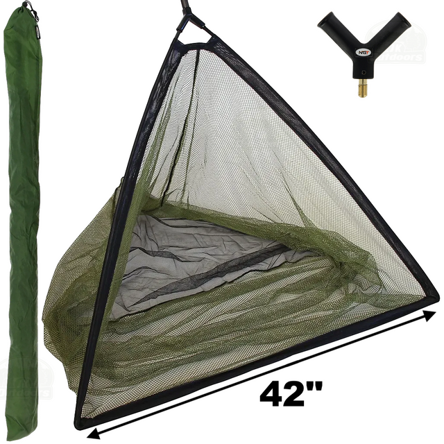 A 42 inch black and green two-tone specimen carp / pike landing net with metal spreader block and nylon case / stink bag included.
